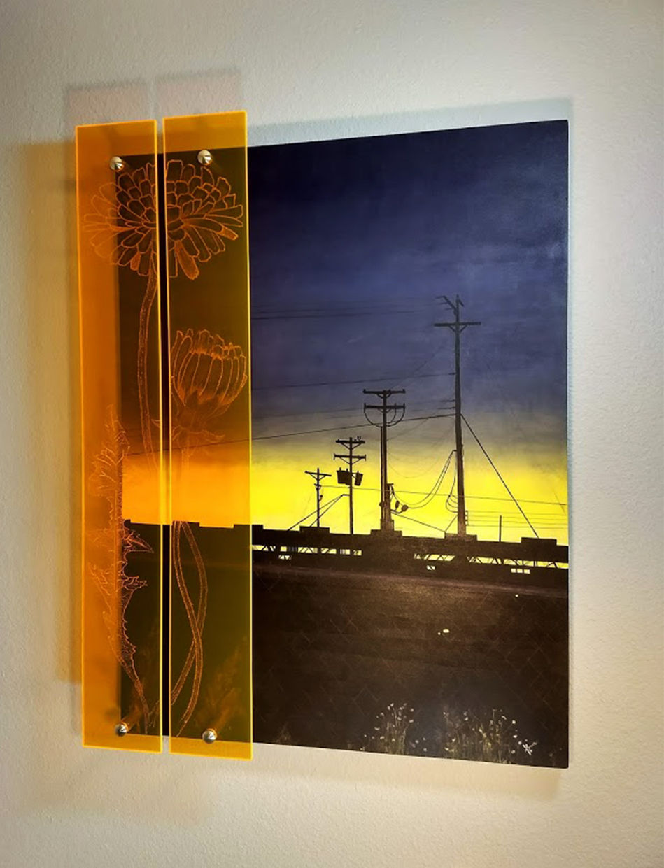 Ready to hang artworks, mounted on 2" wide stained board. Watermedia with an attached engraved sheeting held 1 1/2" from the base. Acrylic sheets can be removed for storage and travel